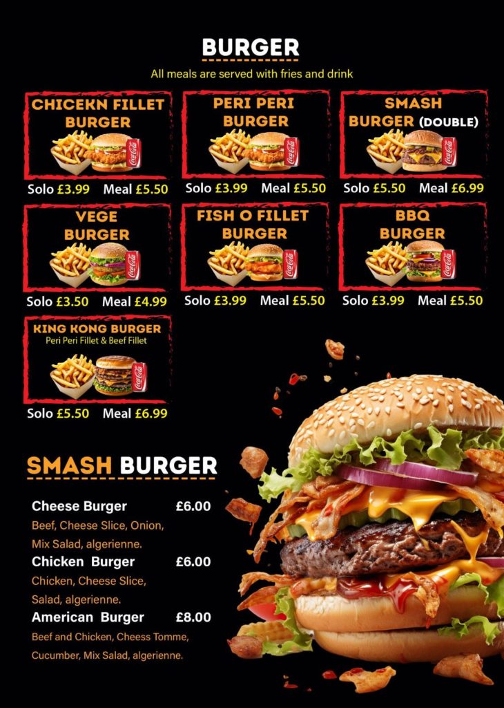 Whether you’re craving a juicy Smash Burger, spicy Peri Peri Chicken, or a hearty Full English Breakfast, we’ve got something for everyone.